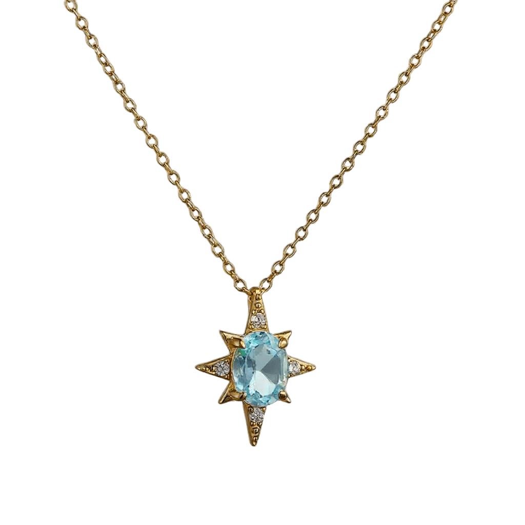 Featuring a radiant aquamarine centre stone nestled in an eight-point star design, this gold-plated beauty evokes the mystique of constellations and the magic of starlight. Perfect for gifting or wearing on special occasions, Astrella is your personal reminder to sparkle boldly and dream endlessly.