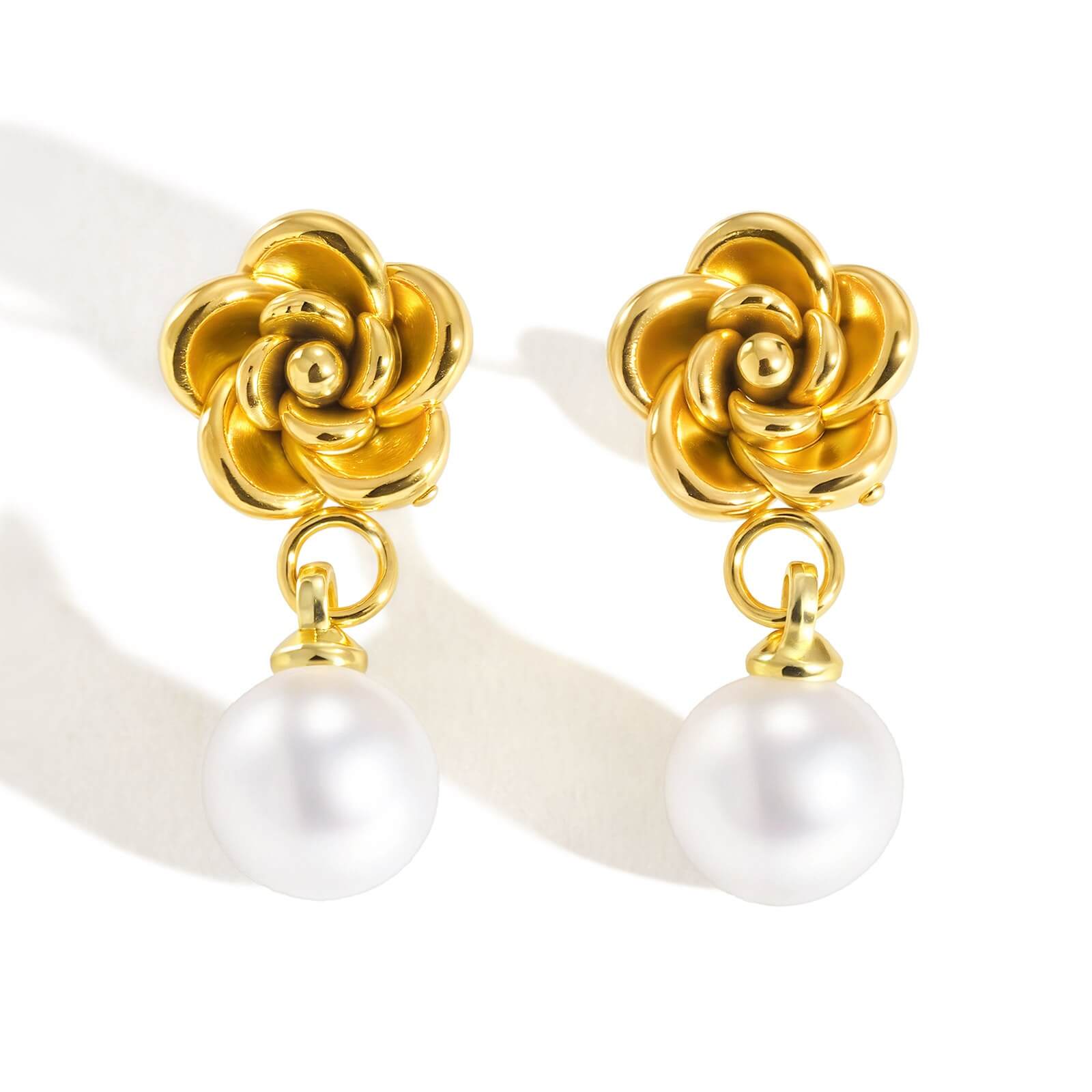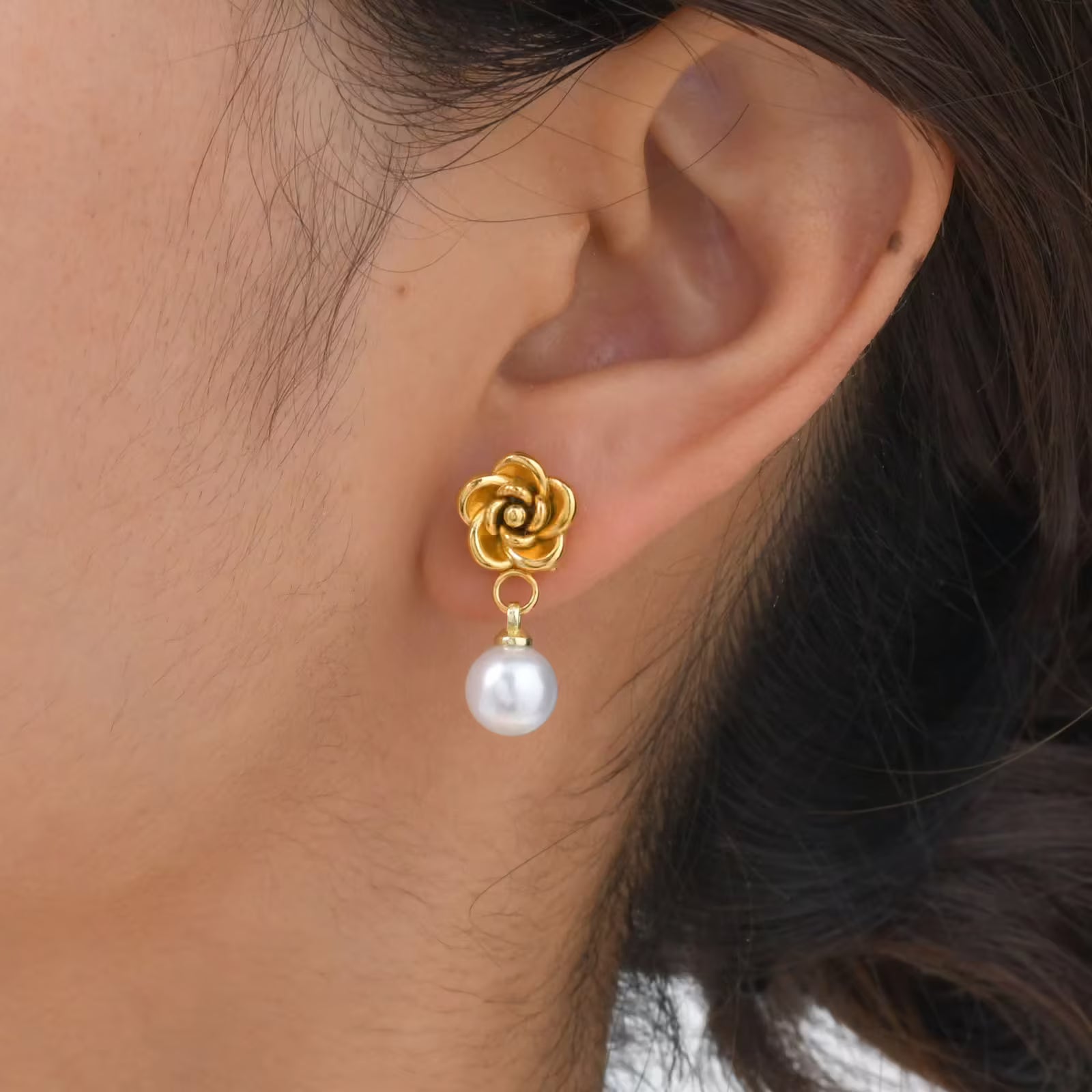 Meet Camellia, a timeless pair of earrings that blend floral grace with classic elegance. Inspired by the delicate beauty of camellia blossoms, each earring features a meticulously crafted golden flower holding a luminous imitation pearl drop.