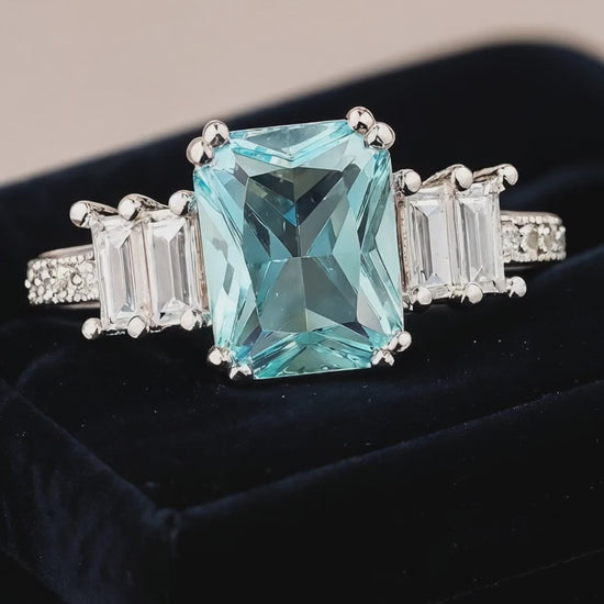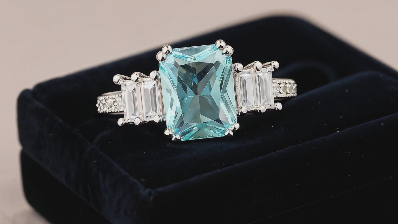 Caelesta features a radiant emerald-cut blue stone set between twin baguette crystals, resting on a polished band of sparkle. Regal yet modern, this ring channels the calm of the sky and the clarity of a star.