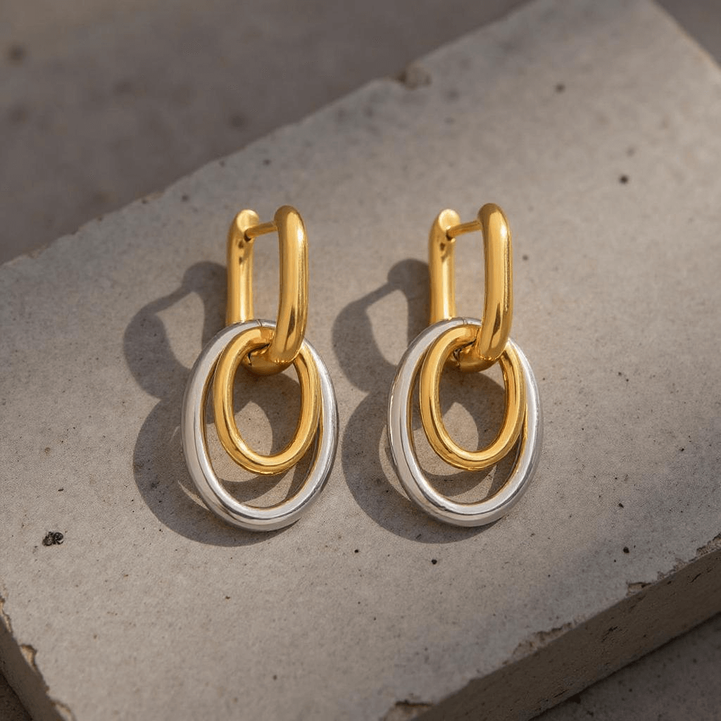 Minimalist design meets modern elegance in the Duella earrings. Crafted in polished stainless steel with a striking two-tone finish, these interlocking hoops symbolise the beauty of duality, gold and silver, boldness and simplicity, timeless and contemporary. Lightweight and effortlessly stylish, Duella adds a touch of sophistication to any look.
