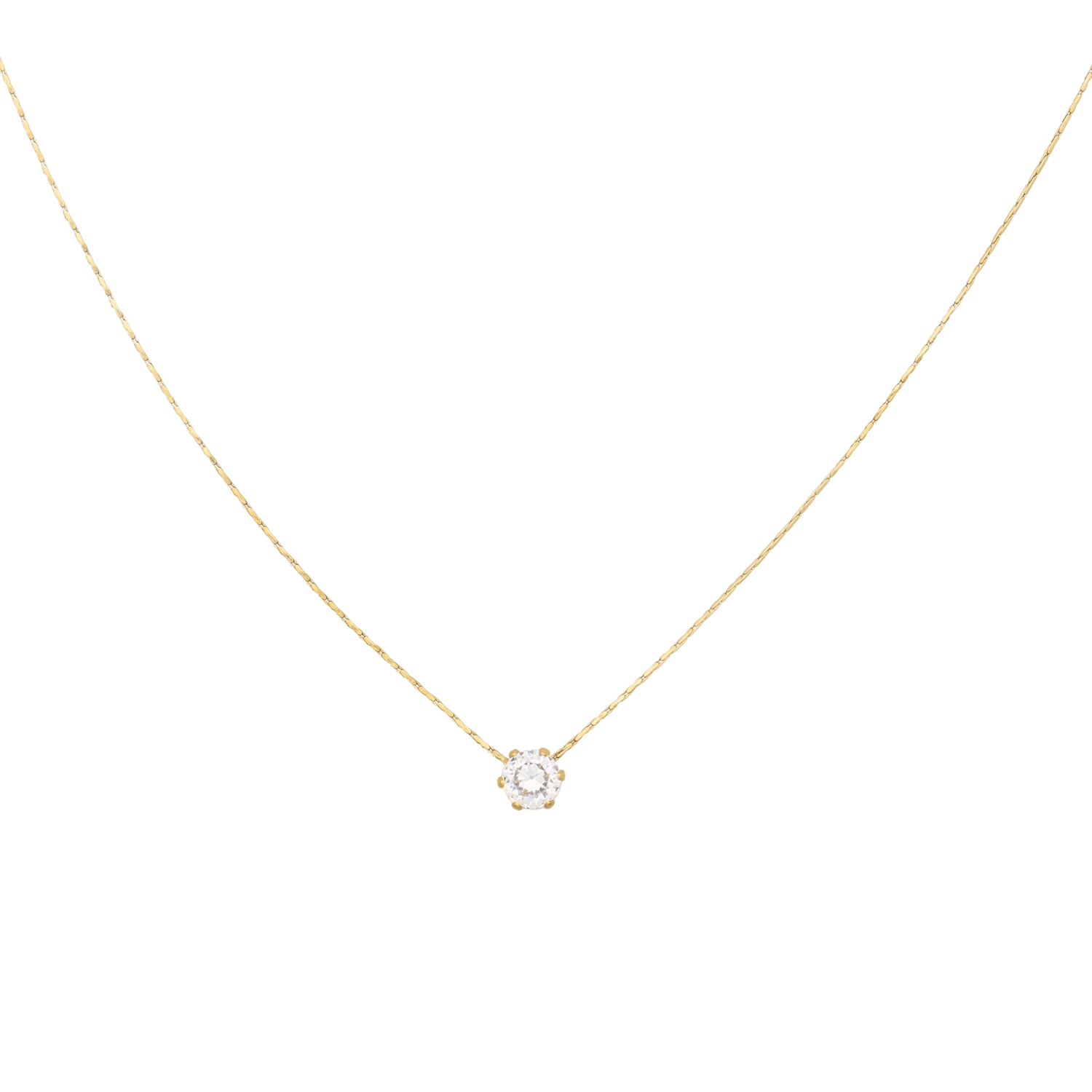 The Fayla Necklace features a dainty gold chain paired with a brilliant-cut central stone that catches the light with every movement. A piece designed to elevate your everyday elegance, perfect for layering or wearing solo.