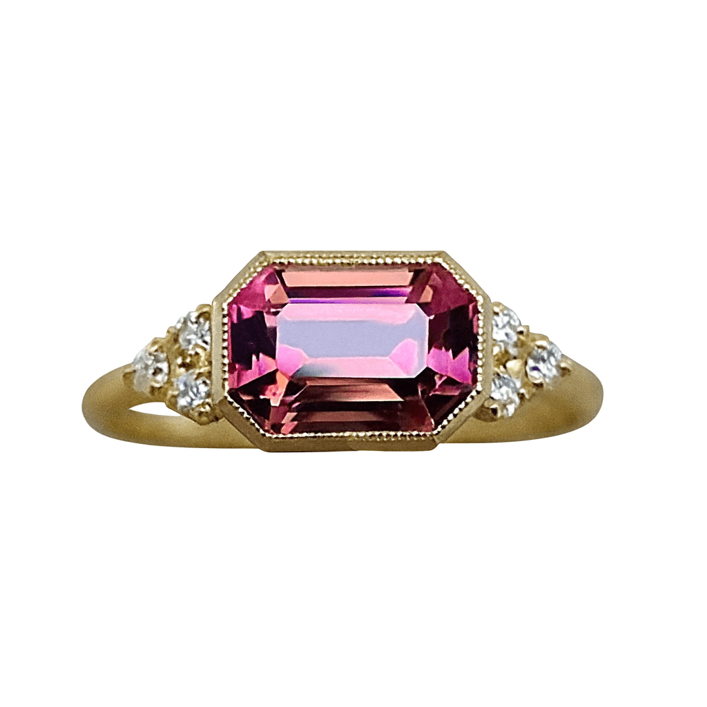 Inspired by timeless romance, the Isolde Ring showcases a radiant pink emerald-cut gemstone framed in warm gold. Delicate diamond accents on each side add brilliance, making this piece a true symbol of elegance and love. A vintage-inspired design for those who cherish classic beauty with a modern touch.