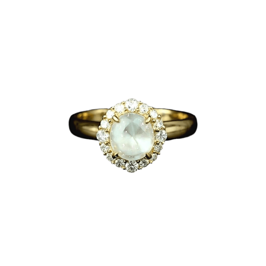 Set in warm gold and encircled with a halo of shimmering white stones, its glowing moonstone centre holds a timeless allure.