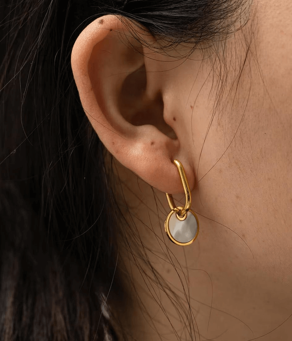 Orella captures the quiet luxury of the sea. Each earring features a round disc of natural white mother of pearl, set against a sleek 18K gold-plated hoop. Like a hidden treasure discovered in the depths, its surface shimmers with a soft, iridescent glow that feels timeless yet modern.