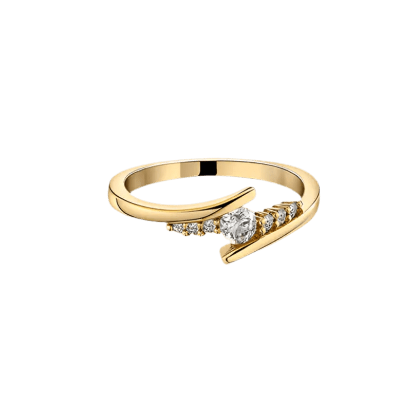 Named Soluna, this ring captures the magical moment when day and night entwine. Its golden band gracefully curves like an orbit, cradling a brilliant centre stone that shines like the first star of evening. Tiny pave set crystals trace a path of light, celebrating the harmony between strength and softness. Wear Soluna as a symbol of your own luminous balance, a reminder that you can hold the sun and moon in your hands.