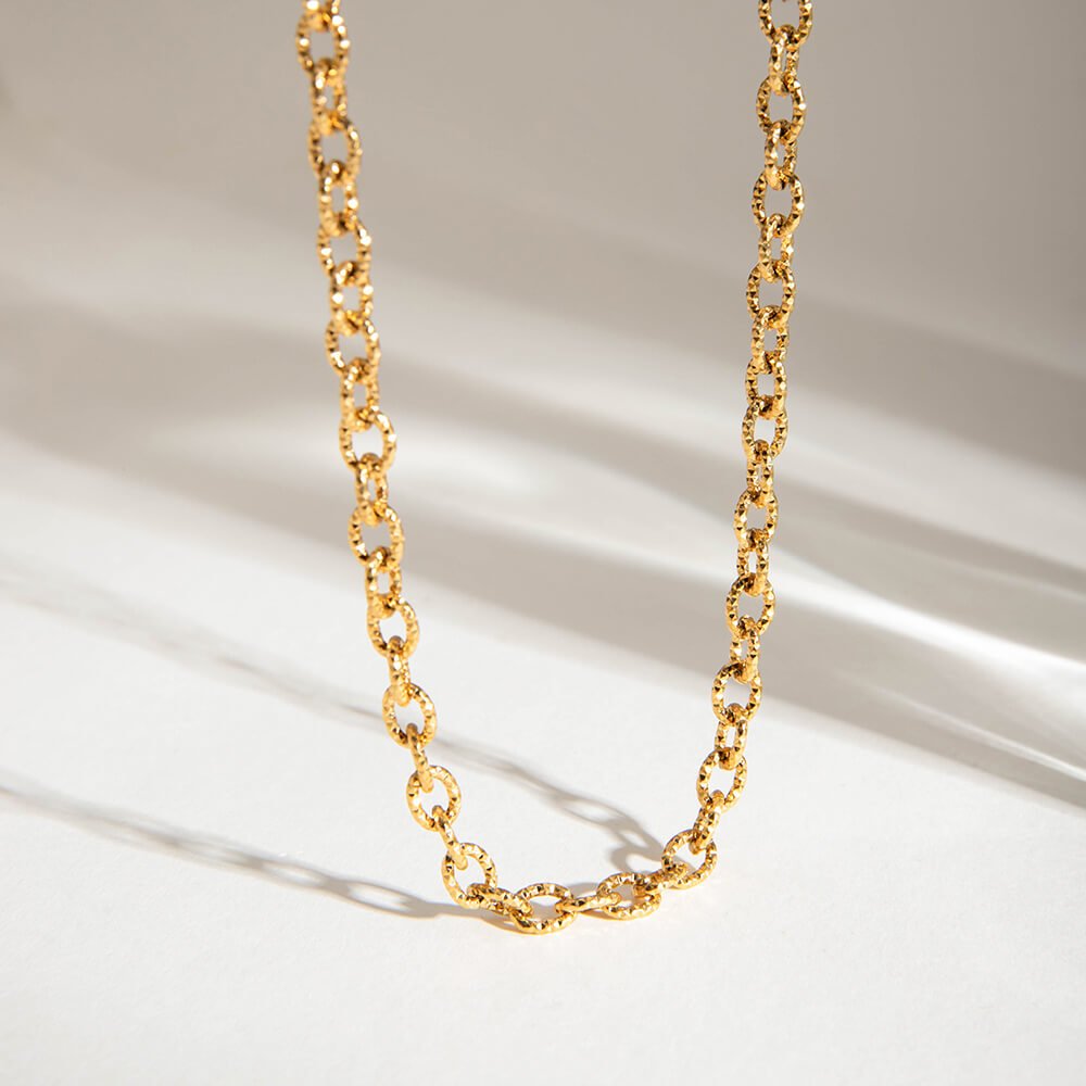 Each delicate link is textured to reflect the light like a thousand tiny stars scattered across the night sky. Crafted from hypoallergenic stainless steel and wrapped in warm 18K gold, this necklace is designed to move with you, whether you’re dressing up for a celebration or adding a touch of radiance to your everyday routine.