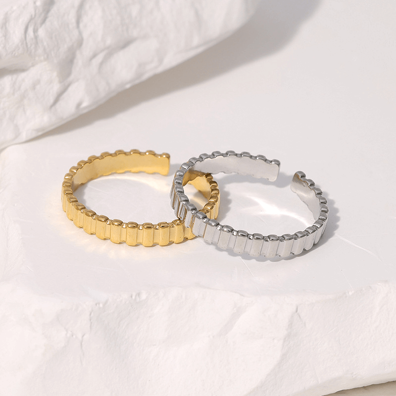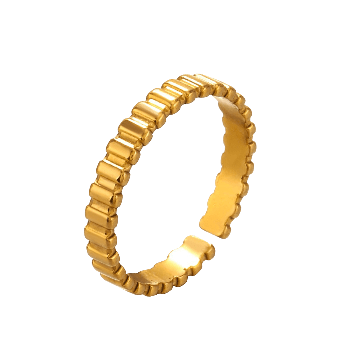 The Velric Ring brings a sleek, modern edge to timeless gold elegance. Featuring a unique, ridged band design, this piece is perfect for stacking or wearing solo. Lightweight, adjustable, and crafted with a waterproof, hypoallergenic finish. Velric is built for everyday wear without losing its shine
