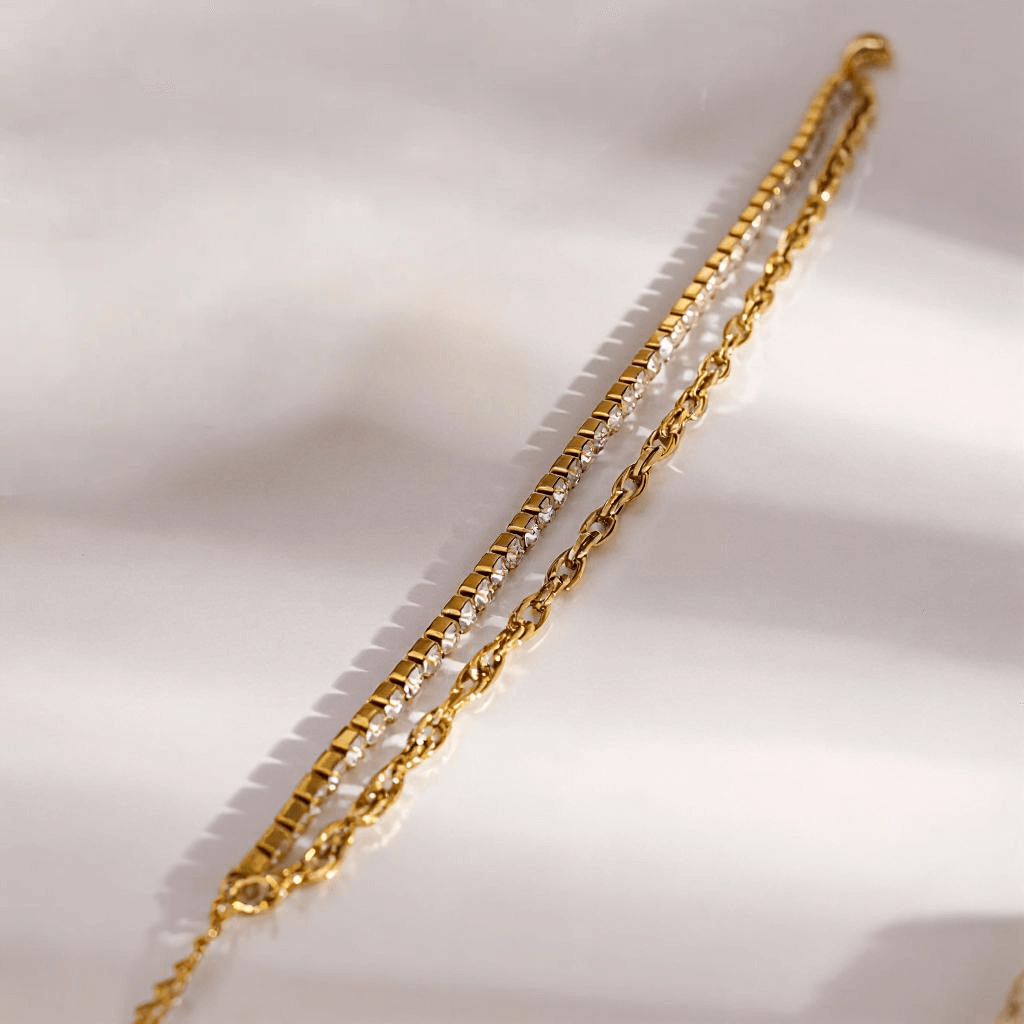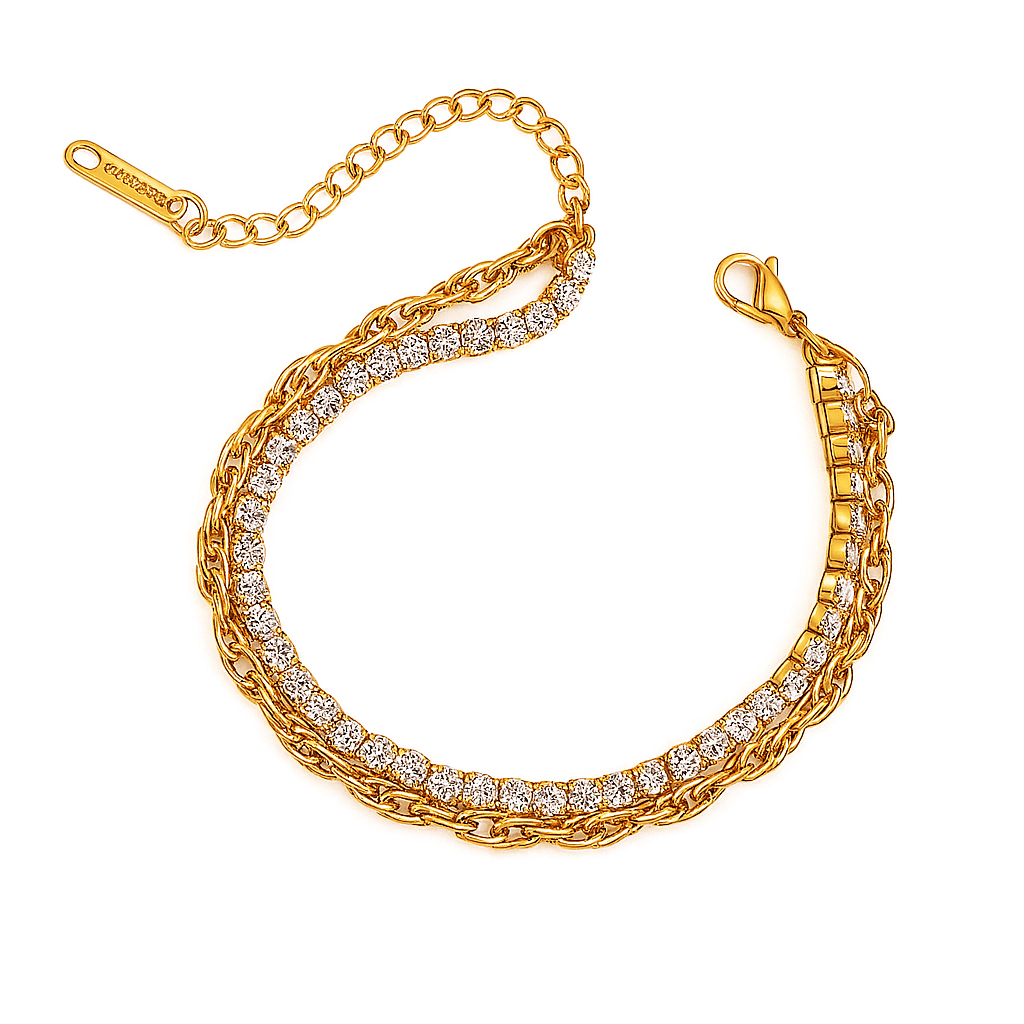 Let your wrist shimmer with the refined elegance of Zivelle. This dainty double-layer bracelet features a combination of a sparkling rhinestone chain and a sleek gold link chain, delicately intertwined to create a radiant statement. Crafted from premium stainless steel and finished with 18k gold plating, Zivelle is waterproof, tarnish-resistant, and skin-friendlymade to accompany you from day to night effortlessly.